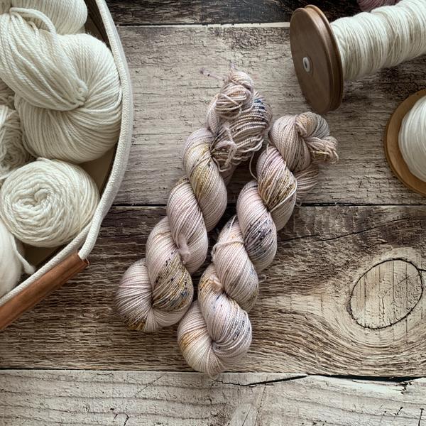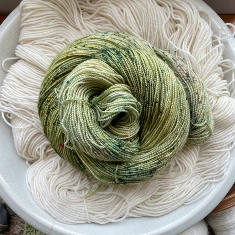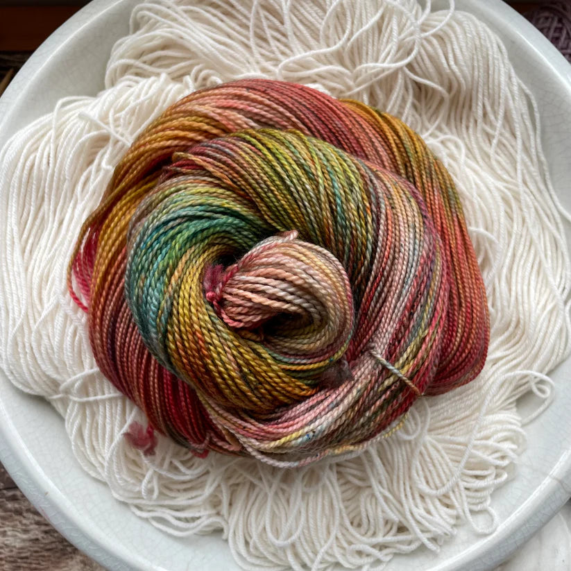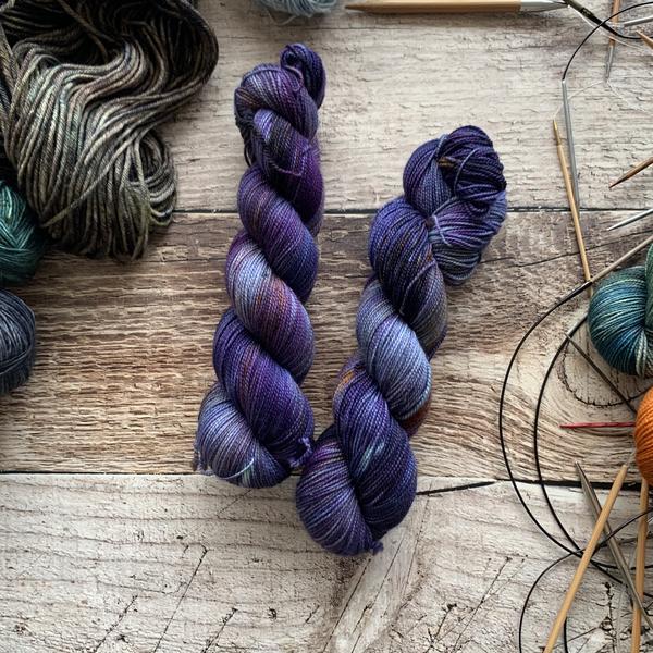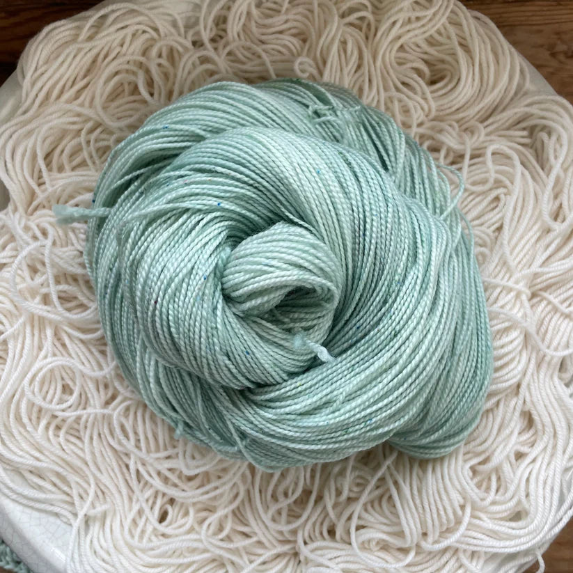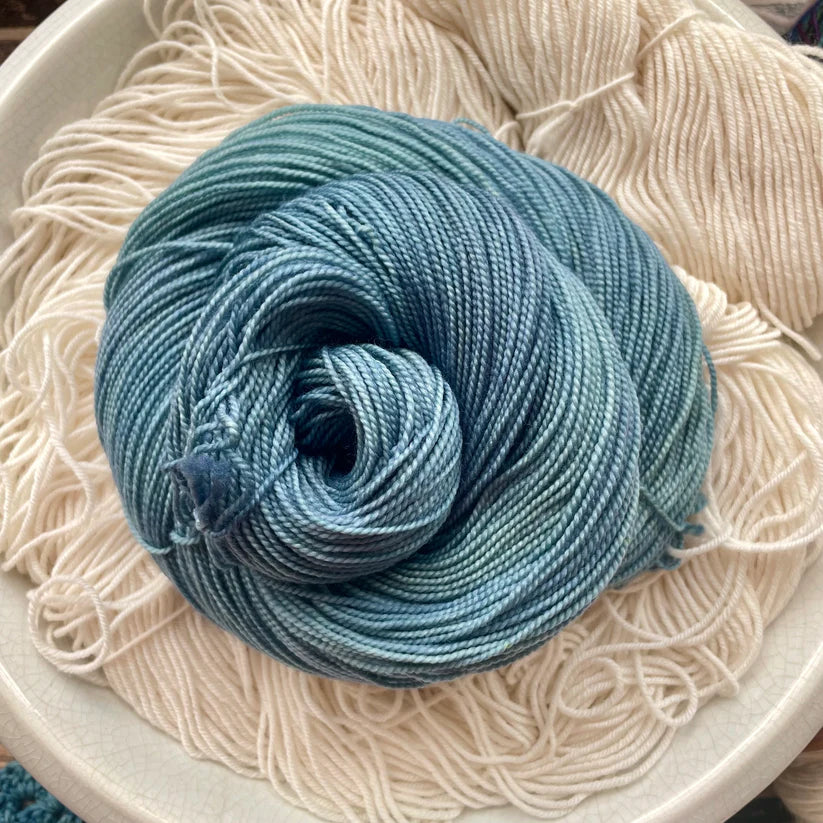 Nimble sock is a 19.5 mircon superwash merino wool 2 ply yarn with 15% nylon. It has that great bounce like my old Everyday Fingering base, but with the softness of my Plush collection!
